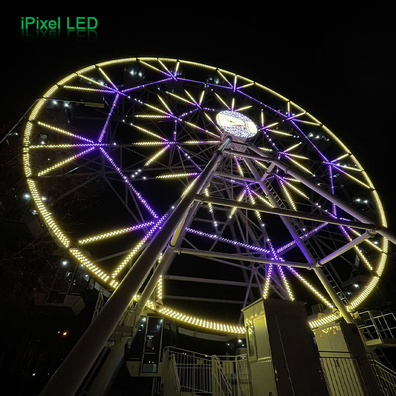 This is a very big ferris wheel in Russian.There are two different led pixel lights used on this ferris wheel. On these arms are the big led pixels, and the middle disc is the small one. In addition to the difference in size, these two led pixels are also different in the way of installation. led pixel 1:100PCS/string, the middle with 100mm wire connected, each string with a pair of male/female waterproof connector; Moreover, the pixel light is fixed on the aluminum profile and does not require additional clip for installation. led pixel 2: Each led pixel has a pair of male and female connector separately, you need connect each pixel light through the male/female connector; And this led pixel needs to go through the front hole, and then each led pixel is secured with a clip. Since this project is in Russia, all the products need to be used in low temperatures and outdoor environments. The power supply is Mean Well waterproof HLG series; Each LED pixel with glue covered; The Controller is also putted in a waterproof box; Connector and extension cables are also waterproof for outdoor use. If you have an LED project or idea, please feel free to contact us.