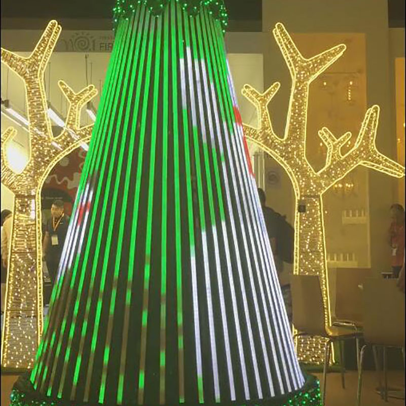 This Christmas tree we showed in HongKong Light fair Oct 2016 the body consisted by 50pcs Aluminum bar ,each bar in 2Meters High inside is a non-waterproof digital strip