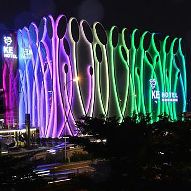 This building has 36 pcs of leaf (23 Leaf design in front side of wall) White color painted on metal frame two of the side view clear Acrylic LED Pixel string light