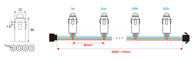 50pcs in a chain, LED Pitch 80mm, but wire length can be customized